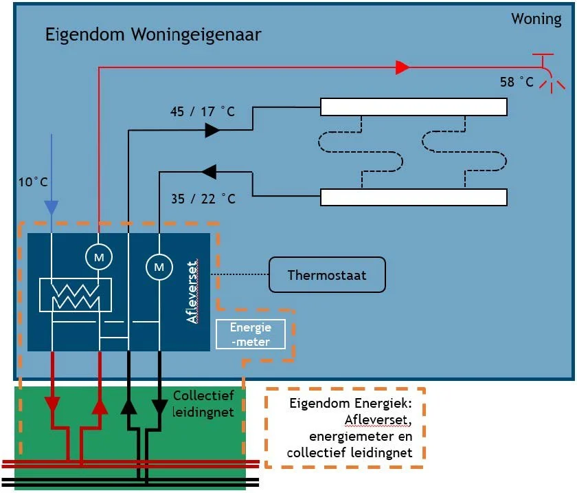 In uw woning of bedrijfspand is een afleverset geplaatst. Deze afleverset heeft een warmtemeter en een meter voor warm tapwater. De gecombineerde vloerverwarming en vloerkoeling van uw woning en de warm tapwaterleidingen in uw woning zijn op deze afleverset aangesloten. Op de pagina documenten vindt u een handleiding en instructie hoe u op de digitale verbruiksmeter bij de afleverset uw verbruik van warmte en warm tapwater kan uitlezen.